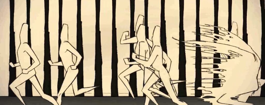 | From Jazz to Jackboots | Justin Stephenson | Canada | 14.45 | “…they loathe art, the product of a yearning for life, because that, too, evades control.” Josef Skvorecky “From Jazz to Jackboots” is an experimental animated dance film exploring the Nazi regime’s methodical restriction of jazz through their “10 Rules for Dance Bands.” The film reimagines itself through progressively censored variations of jazz standard, “Minnie the Moocher,” transitioning from freeform expressionist painting and collage to statuesque perfection. Through sophisticated animation techniques and meticulous visual design, the work unfolds as simultaneously joyful, lyrical, ethereal, surgical, horrific and funereal—a timely reminder that the battle between artistic expression and authoritarian control remains urgently relevant today. |